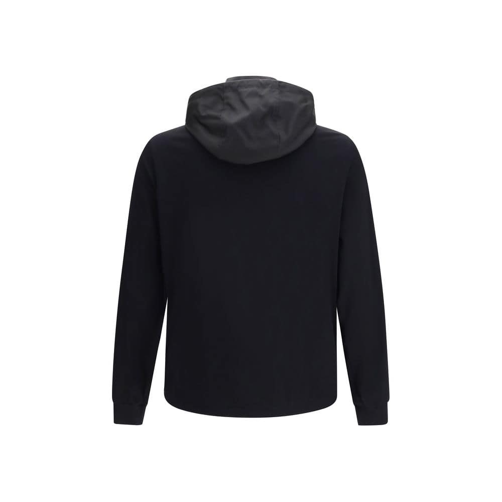 The Hooded Jacket by Prada features a front zip fastening and a functional, contemporary design. It is designed with three pockets: two side zip pockets and a single pocket crafted in contrasting material, enhanced by an applied metal logo plaque that adds a distinctive and recognizable touch. The hood completes the piece, combining practicality with refined aesthetics.