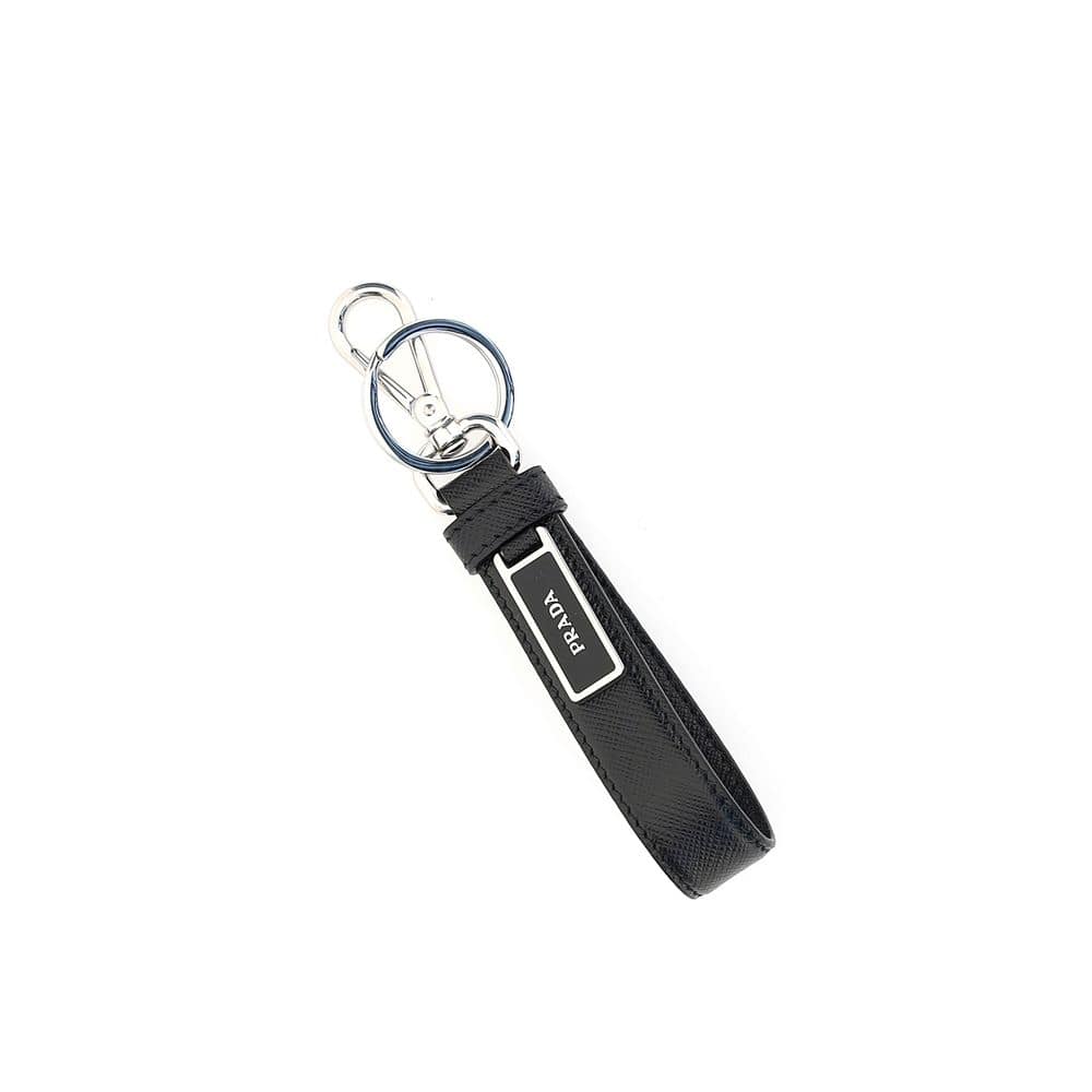 The leather Keychain by Prada is crafted from fine leather and features a metal hook closure, enhanced by an enamelled logo plaque that adds an iconic and refined touch. A compact and functional accessory, perfect for elevating everyday essentials.