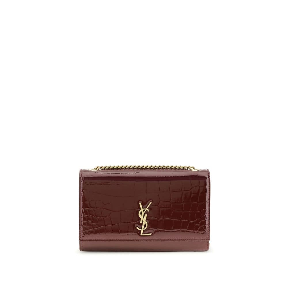 The small Kate Shoulder Bag by Saint Laurent, crafted from crocodile-embossed patent leather, combines modernity and elegance. The chain strap allows you to carry it comfortably over your shoulder, while the leather lining, bronze-colored hardware, and automatic magnetic closure ensure quality and functionality. Inside, there is a practical flat pocket for your essentials.