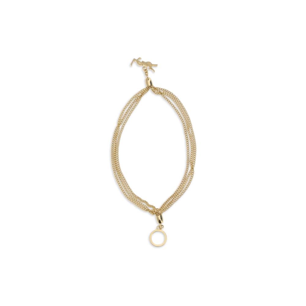 The Cassandre Bracelet by Saint Laurent is crafted from metal with a delicate chain, embellished with a tassel and the distinctive CASSANDRE pendant at the center. The adjustable lobster clasp ensures a practical and secure fit, while the SAINT LAURENT PARIS engraving adds an iconic and elegant touch to the design.