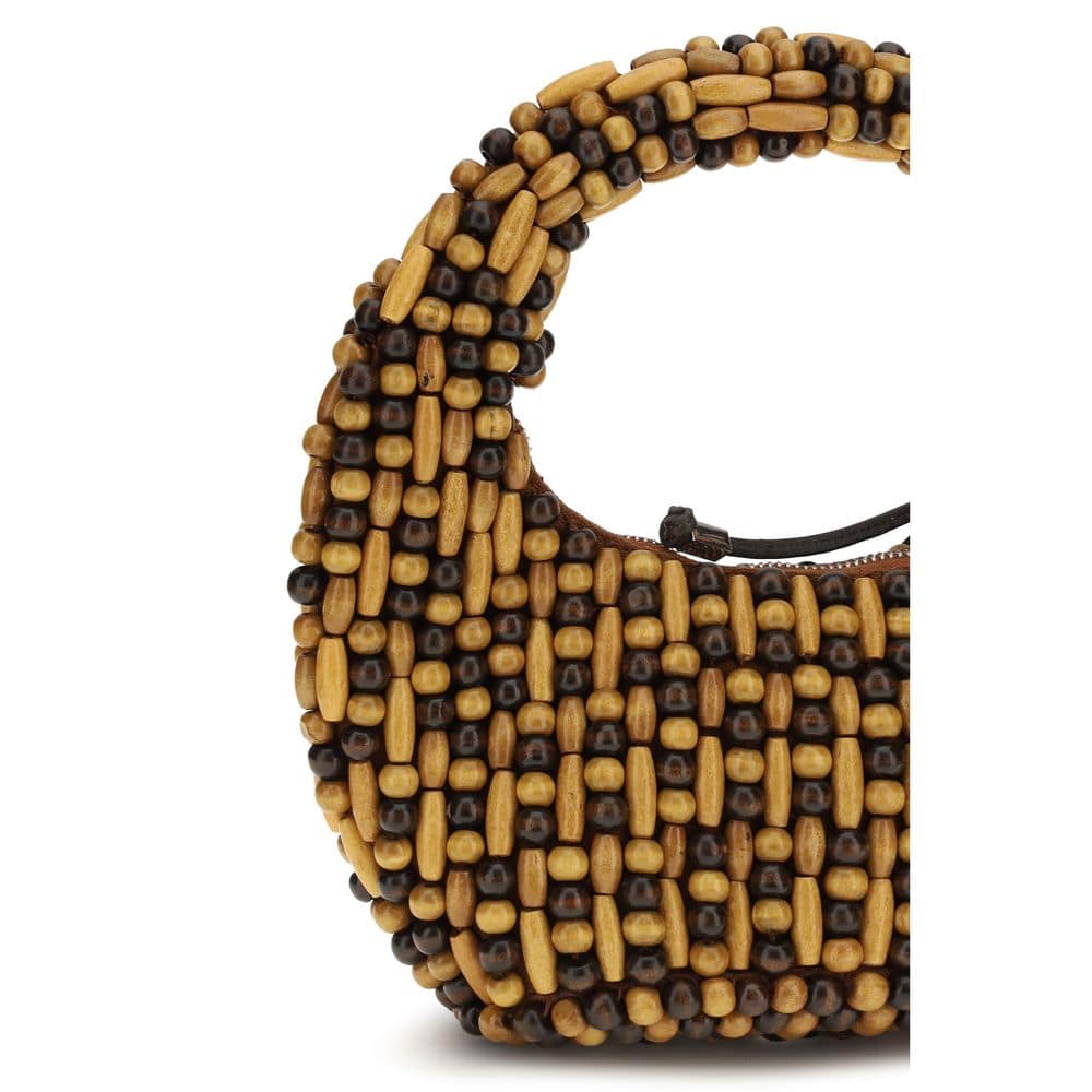 The Reef Handbag by Staud is an original and distinctive accessory, crafted with elegant dark wood beads that create a refined, artisanal texture. Designed to be carried by hand, it features a curved top handle that enhances its silhouette and ensures a comfortable grip. The zipper closure ensures practicality and security, making it perfect for adding character to both casual and more sophisticated looks.