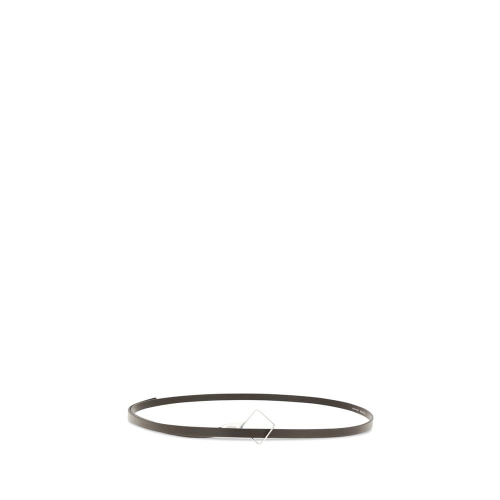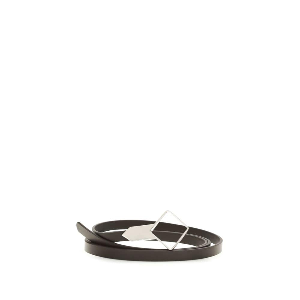 The Rhombe Belt by The Row is a slim accessory crafted from smooth leather, featuring a silver rhombus-shaped buckle, combining minimalism and sophistication to elegantly complete any outfit.