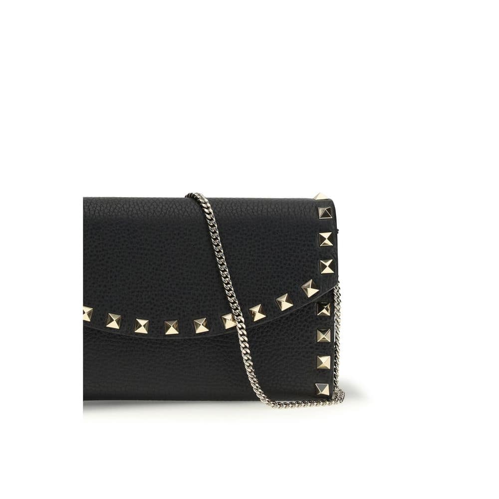 The Rockstud chain Wallet by Valentino Garavani is a refined and versatile accessory, crafted in garnet calfskin for a touch of elegance. Rockstud studs and platinum-finish hardware add a distinctive and bold detail. Thanks to the removable chain, it can be worn either by hand or over the shoulder/across the body, offering practicality and style. The interior is organized with an internal wall pocket and three card compartments, while the nappa lining adds a touch of luxury. The magnetic button closure ensures security and ease of use.