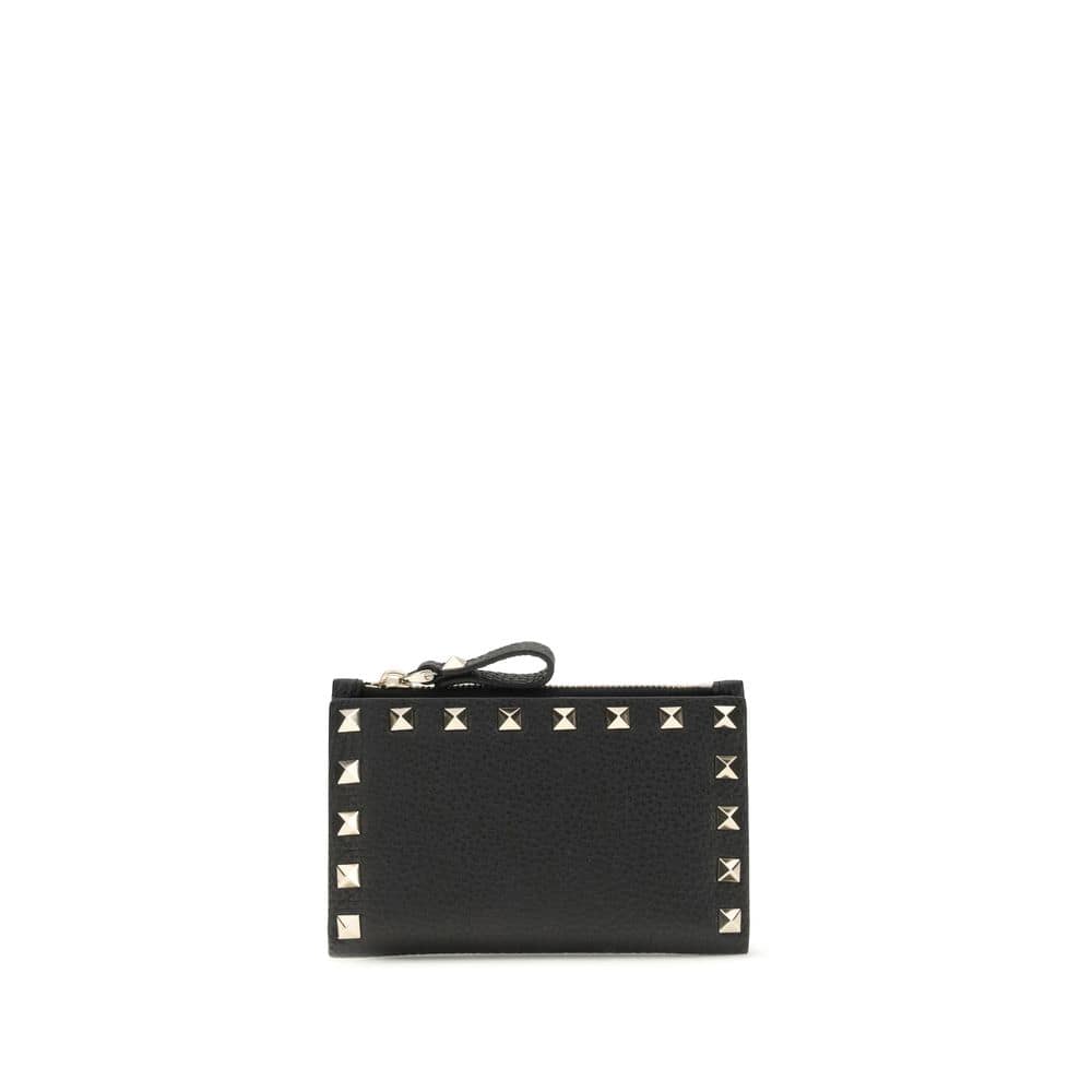 The Rockstud Card Holder by Valentino Garavani is crafted from garnet calfskin leather and embellished with iconic platinum-finish studs. The model features a snap closure, a zippered coin compartment, six card slots, and two flat pockets, offering practicality and style in a compact and distinctive design.
