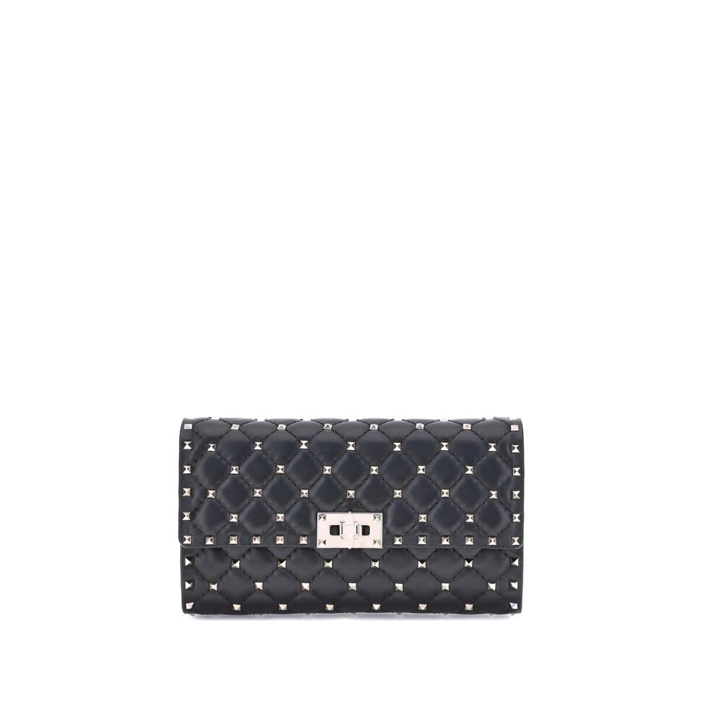 The Rockstud Spike Shoulder Bag by Valentino Garavani is an elegant and bold accessory, crafted from soft lambskin with diamond quilting and decorated with small studs. The flap with a turnlock closure and platinum-finish metal details add a distinctive touch, while the removable chain allows it to be worn on the shoulder, crossbody, or by hand. The nappa leather interior features a zippered pocket and eight card slots, combining style and functionality in a single luxury accessory.
