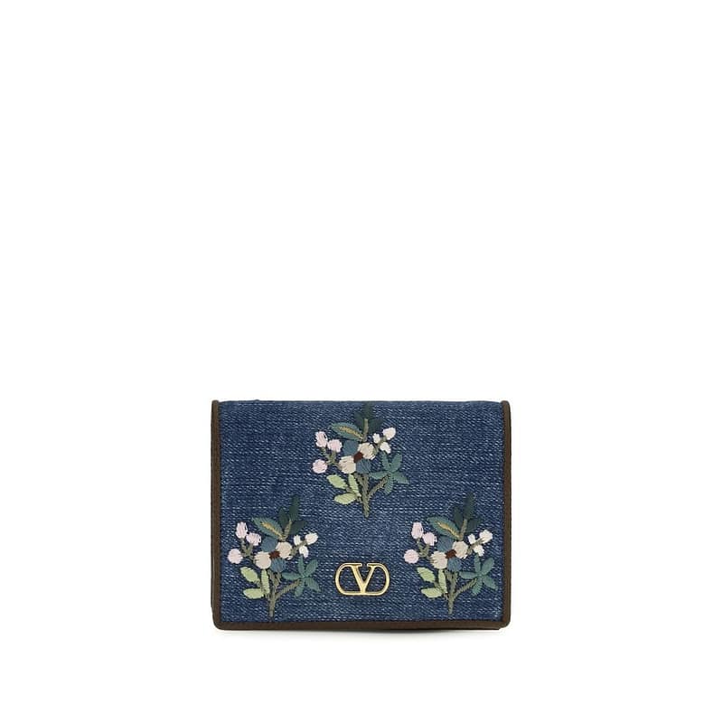 The VLogo Signature denim Wallet by Valentino Garavani combines iconic style with everyday practicality. Featuring the logo and metal hardware in antique brass finish, it has a snap-button closure, five card slots, a flat pocket, a zip coin compartment, and a bill pocket, providing organization and elegance in a single accessory.