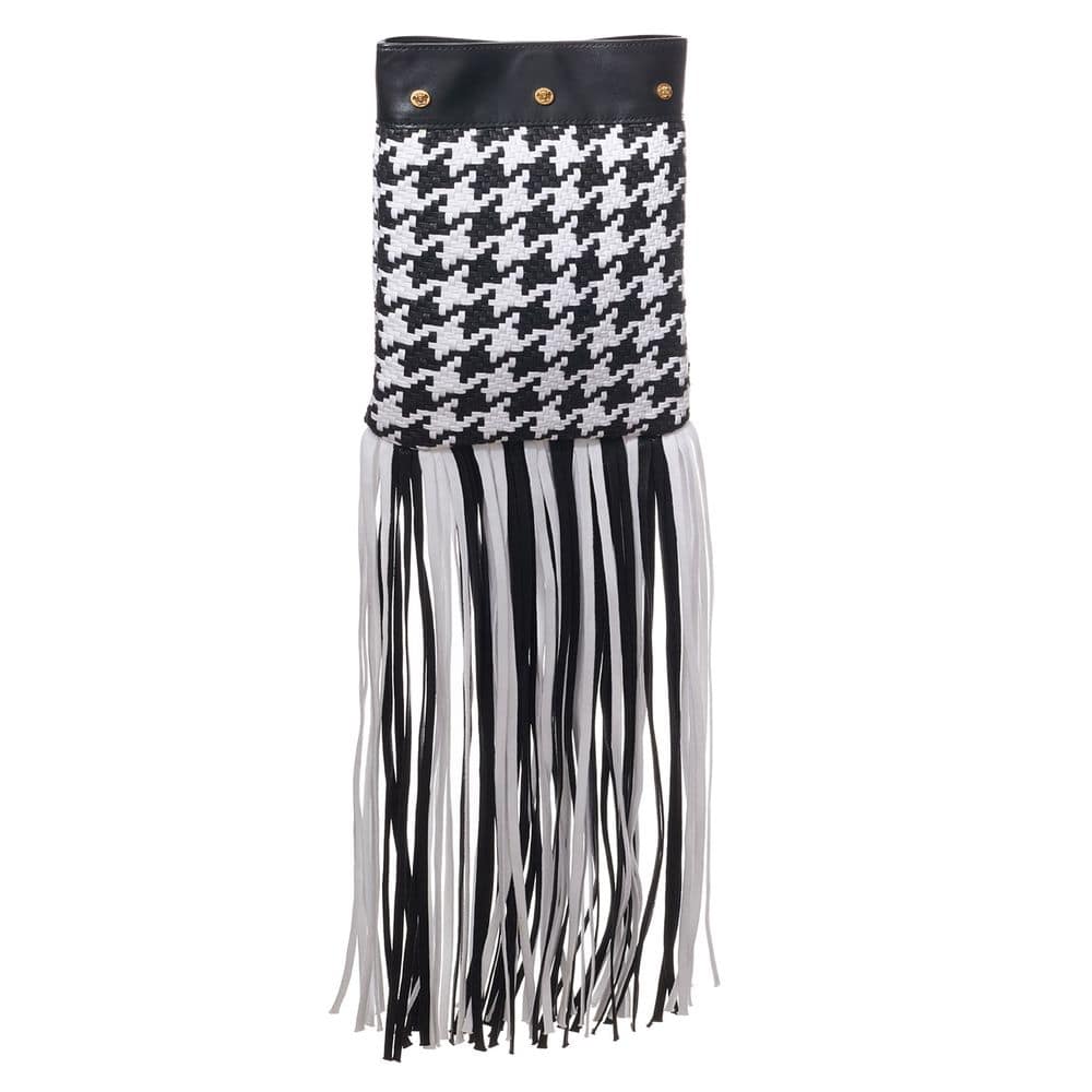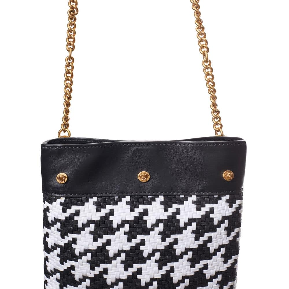 Pied-de-poule shoulder bag with Versace fringes, elongated rectangular shape, black leather shoulder strap with gold chain, black and white fabric fringes. High leather edge with gold studs appliqué, small inside pocket-Sku interior:22FE207