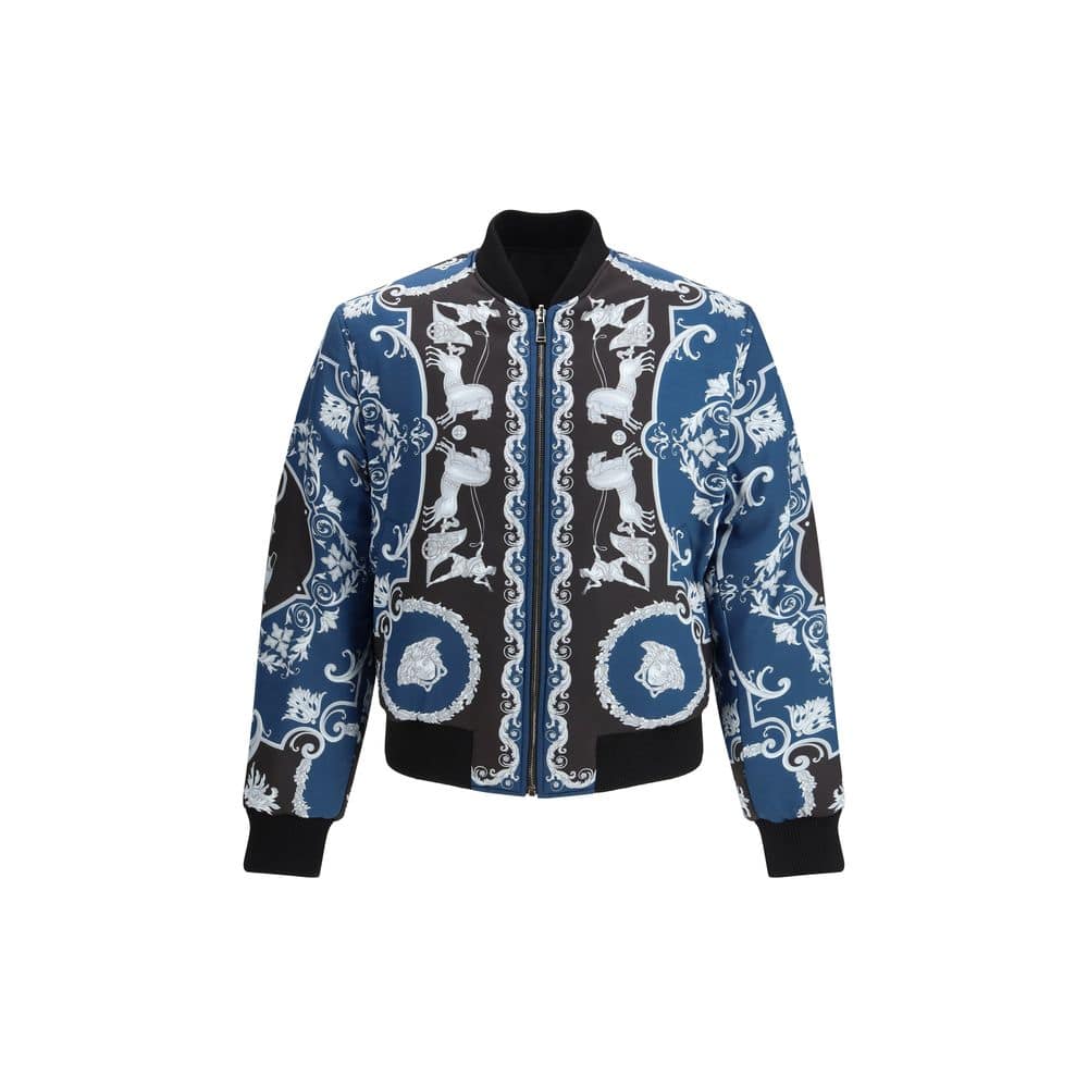 The reversible Blouson by Versace is a versatile piece with a bold presence. It features two front pockets with single-button closures arranged diagonally, and an embroidered logo positioned on the left chest for a signature touch. The jacket closes with a full front zipper, while ribbed cuffs and hem provide structure and a refined finish. A design crafted for dynamic, contemporary elegance.