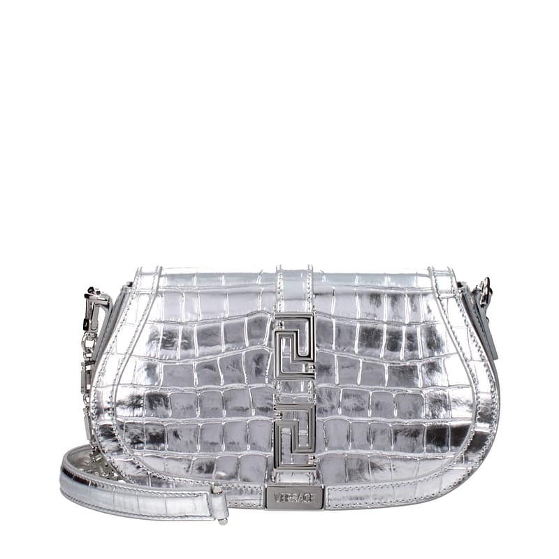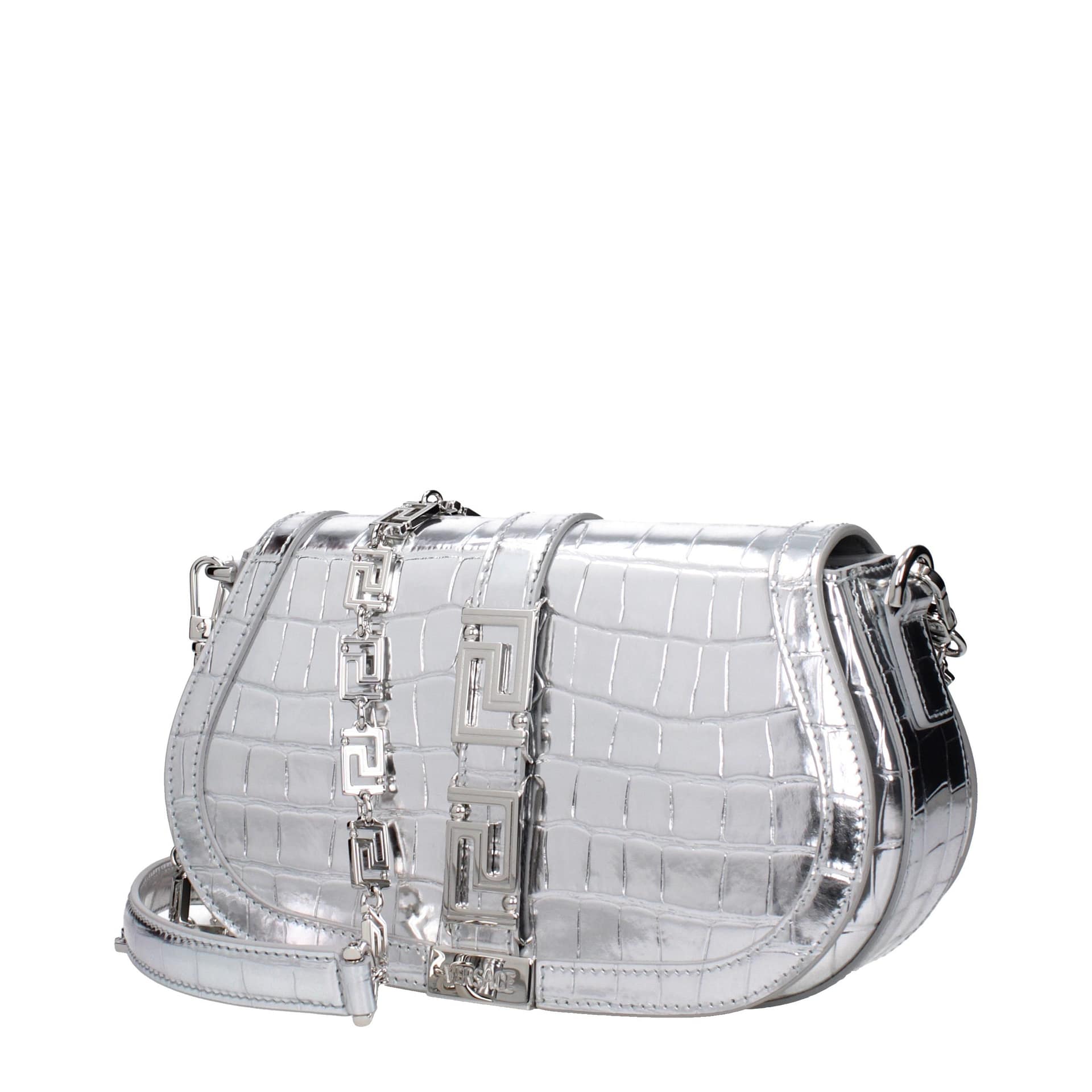 The product with MPN 10234171A100141E56PS and code F86252 leather in silver is a shoulder bags designed by Versace. It has features like front logo, adjustable handle, removable handle, removable shoulder.