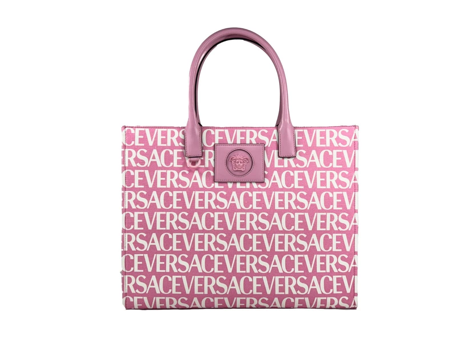 Indulge in luxury with the Versace Medusa Large Canvas Tote Bag, an exquisite blend of functionality and high-fashion sophistication. Crafted from premium baby pink canvas with leather trim, this tote embodies the iconic style synonymous with the Versace brand. Its generous dimensions of 15.5 inches in width and 12 inches in height make it an ideal companion for various occasions, from casual outings to formal events.
