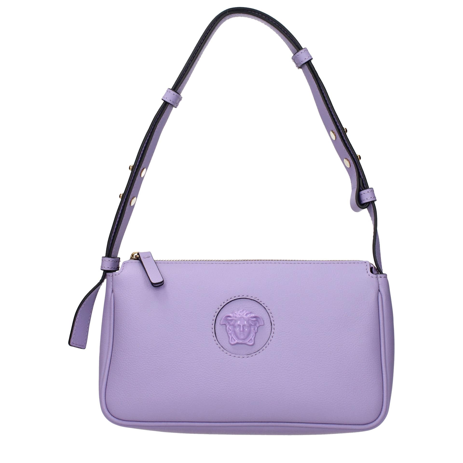 The product with MPN 1014245DVIT2T1L59V and code F80309 leather in violet is a shoulder bags designed by Versace. It has features like front detail, adjustable handle, back logo.