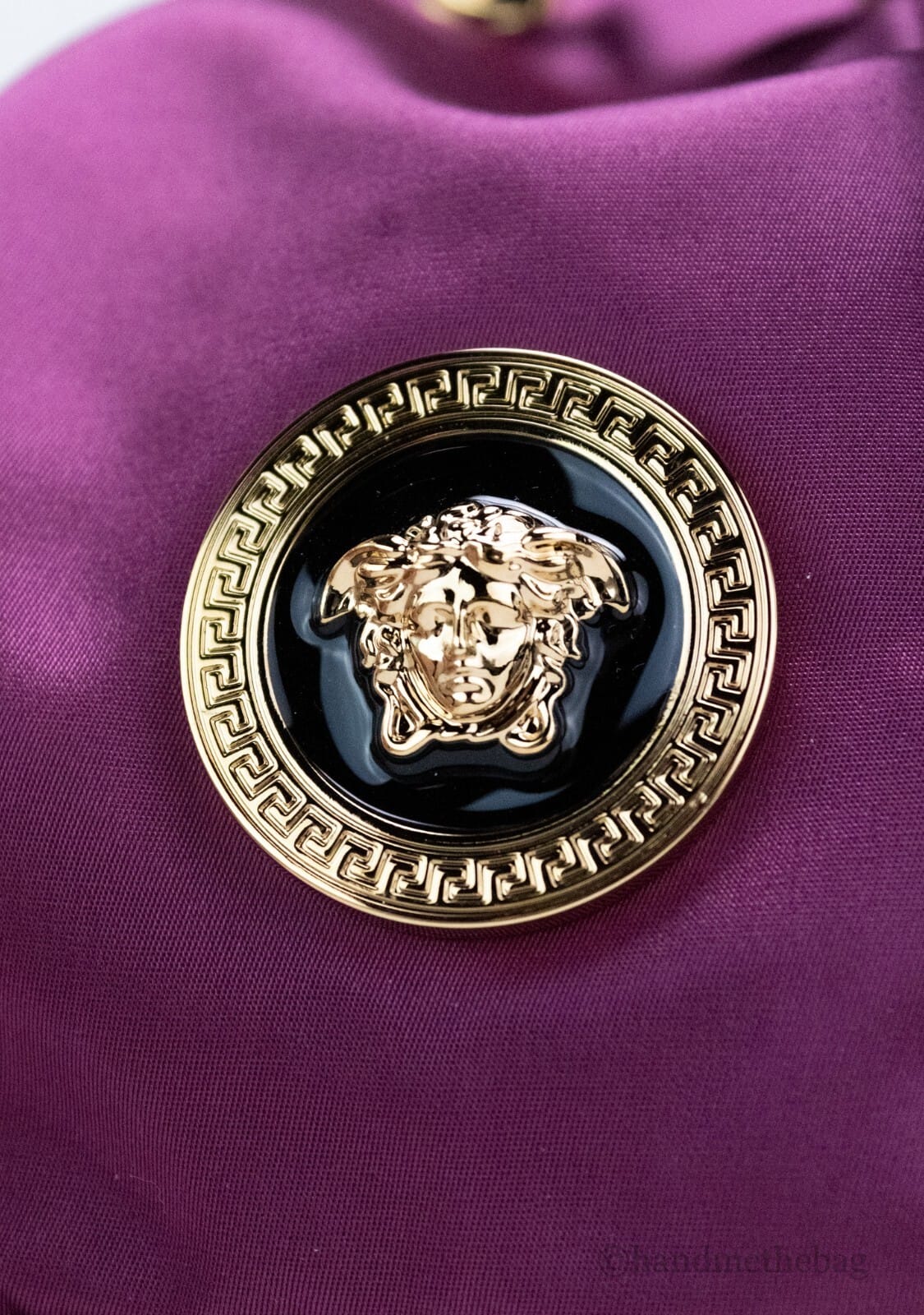 Elevate your accessory collection with the Versace Small Dahlia Nylon Medusa Pendant Bucket Chain Crossbody Bag Purse. Crafted with the iconic Italian flair, this luxurious bag exemplifies both elegance and functionality. Made from high-quality nylon and leather, it features a striking dahlia color contrasted by sophisticated black accents, ideal for adding a pop of color to any outfit.