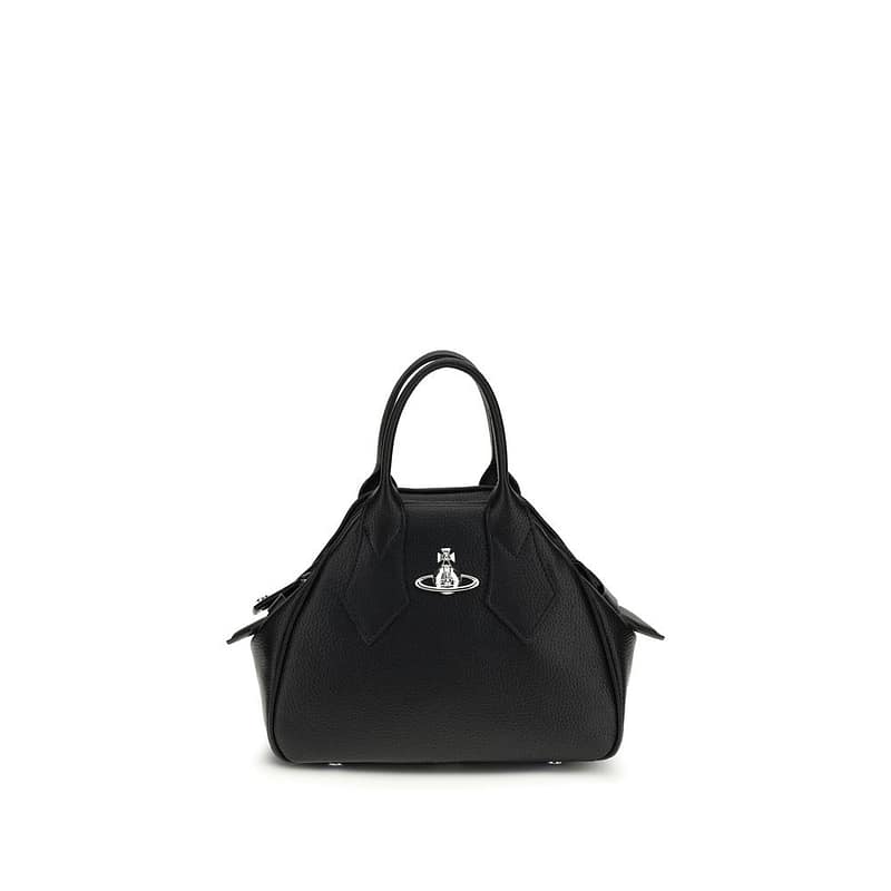 The small Yasmine Handbag by Vivienne Westwood is crafted from hammered calf leather and embellished with a metal Orb detail on the front. Featuring two flat handles in tonal leather and a zip closure, it has a lined interior with a zip pocket and two patch pockets for added practicality. Protective metal feet at the base complete the elegant and functional design.
